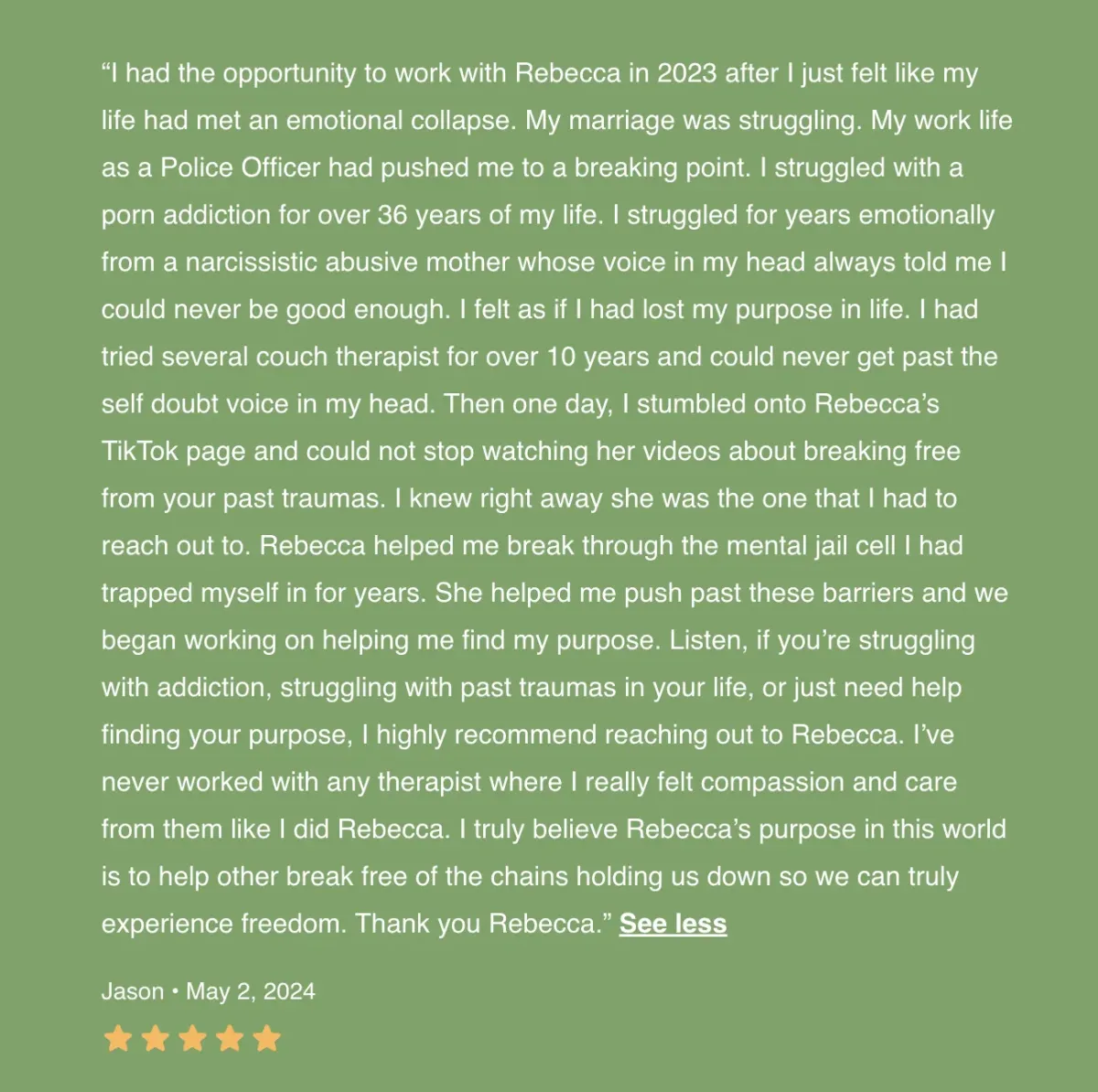 ● This allows you to invest in your healing in a way that also supports your work performance and personal growth If you’re unsure how this works, we can talk it through on your consultation call.